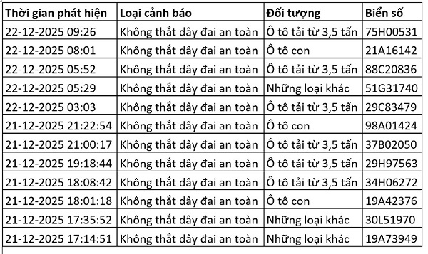Cục Cảnh sát giao thông cho biết từ 12h ngày 21.12.2025 đến 12h00 ngày 22.12.2025, camera A.I tại km 20 tuyến cao tốc Nội Bài -Lào Cai ghi nhận có 14.789 phương tiện đi qua với tốc độ trung bình là 71 km/h. Đồng thời phát hiện 12 trường hợp không thắt dây đai an toàn như sau: