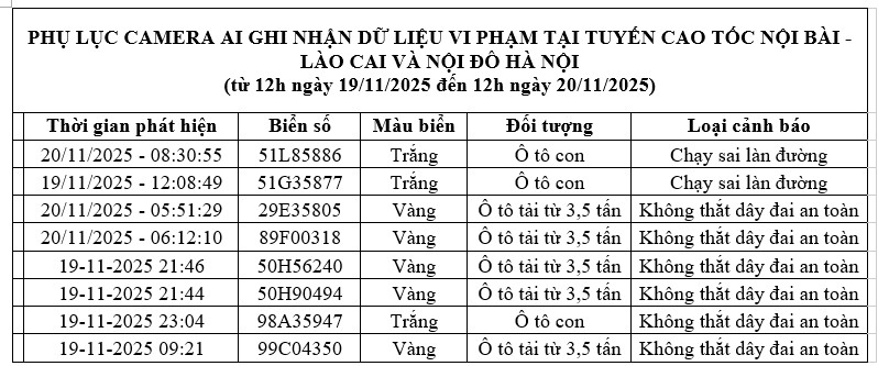 Cục Cảnh sát giao thông cho biết, từ 12h ngày 19.11.2025 đến 12h ngày 20.11, Camera AI phát hiện nhiều xe bị phạt nguội.