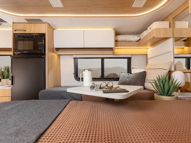 Mẫu nhà di động Unity TBX gây chú ý với khoang chứa đồ dung tích lớn, cho phép mang theo xe đạp, ván lướt sóng hay thiết bị dã ngoại mà vẫn giữ tiện nghi như một căn hộ di động cao cấp.