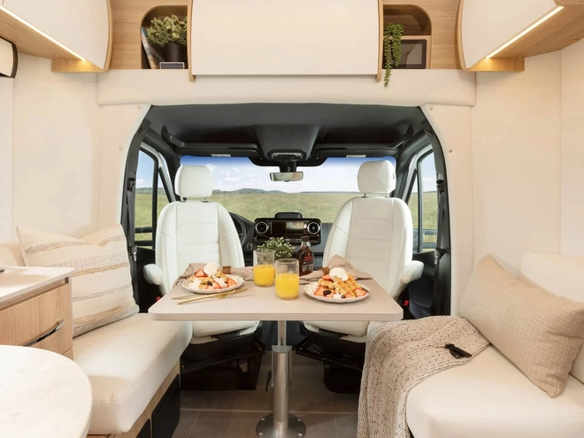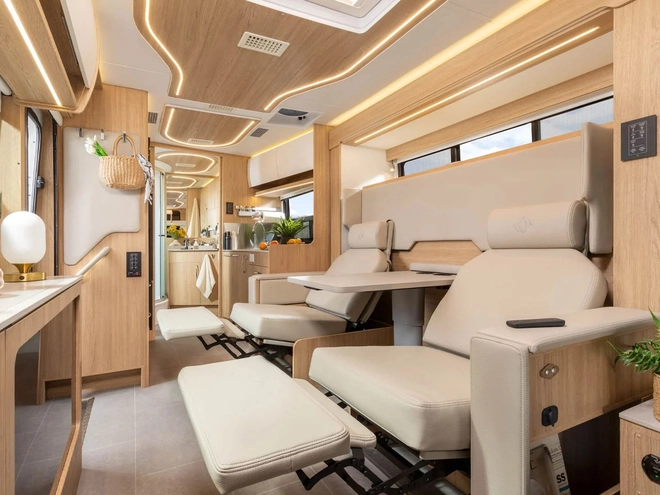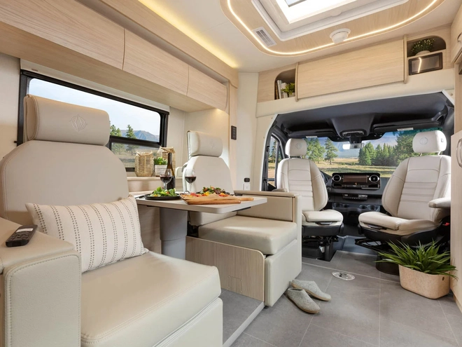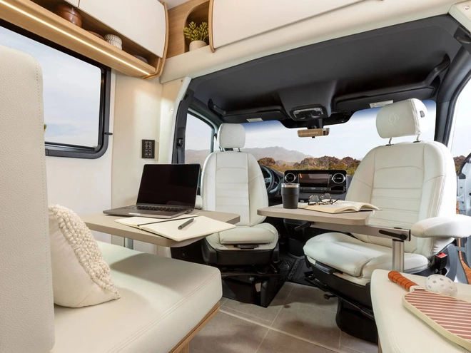 Phía trước xe là khu lounge xoay linh hoạt với ghế băng hai chỗ có thể xoay 90 độ tạo không gian thư giãn, kết hợp thêm ghế đệm thứ ba và hai ghế lái xoay, khu vực này trở thành phòng khách với bàn để ăn uống và làm việc. Toàn bộ khu vực có thể gập lại và chuyển thành giường đôi.