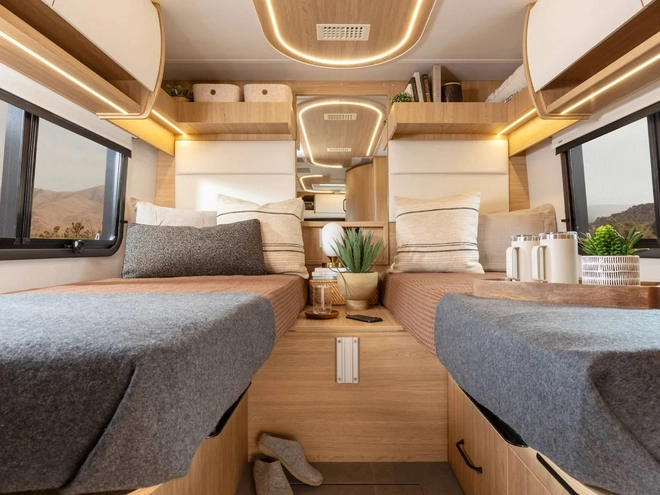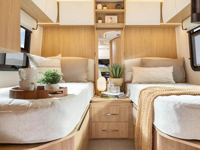 Nội thất cao khoảng 1,9m có thể bố trí chỗ ngủ cho tối đa 4 người. Phía cuối khoang ngủ là hai giường đơn với tủ đầu giường ở giữa.