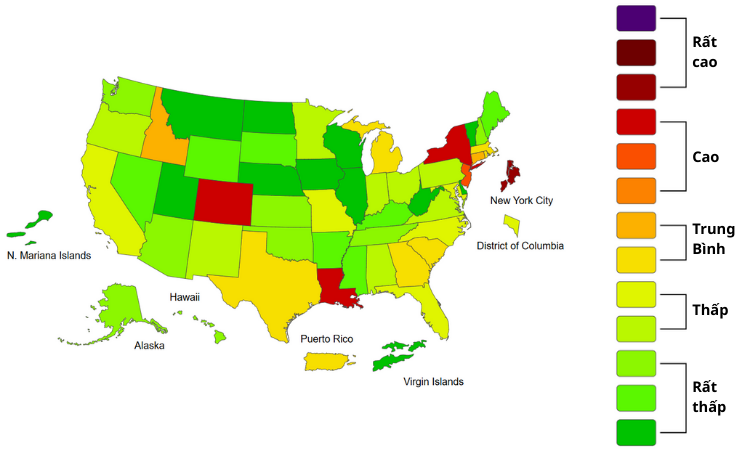 CDC xếp một số bang ở cấp độ nghiêm trọng hơn trong thang đánh giá về mức độ lây lan của cúm. Theo dữ liệu mới nhất tính đến ngày 6/12, bang Colorado, New Jersey, New York và Louisiana đang ghi nhận mức độ lây truyền virus ở ngưỡng "cao".