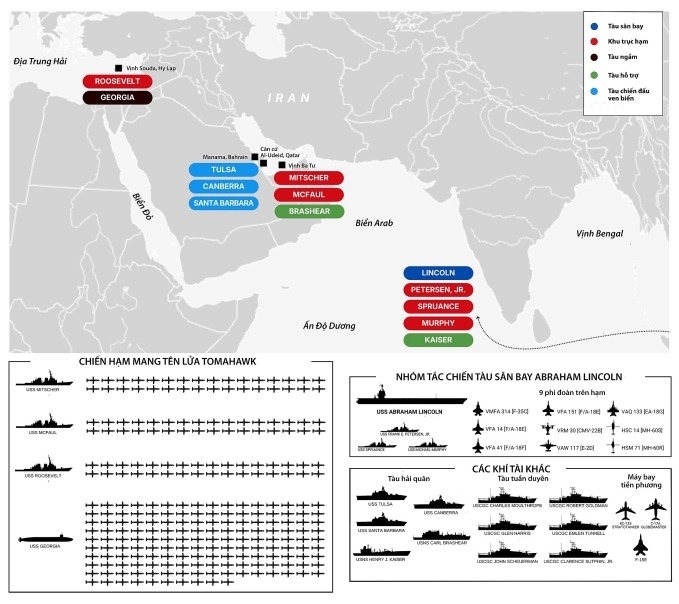 Truyền thông Mỹ dẫn các nguồn thạo tin nói "hạm đội lớn" vừa được triển khai có tàu sân bay USS Abraham Lincoln cùng hàng loạt tàu khu trục trang bị hệ thống chiến đấu Aegis, như USS Spruance, USS Frank E. Petersen Jr., USS Michael Murphy. Các tàu khu trục này còn có khả năng phóng tên lửa hành trình Tomahawk tầm bắn 1.500-2.000 km, cho phép tập kích sâu vào đất liền khi được lệnh.